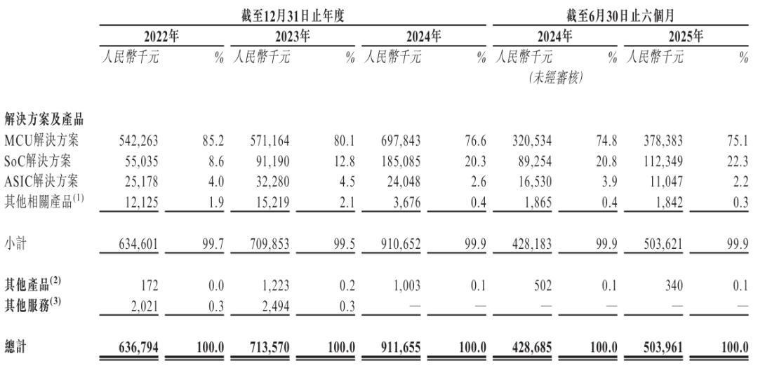中微半导2025年上半年来自MCU解决方案收入为3.78亿元,占比为75.1%;来自SoC解决方案收入为1.12亿元,占比为22.3%;来自ASIC解决方案收入为1105万元,占比为2.2%。