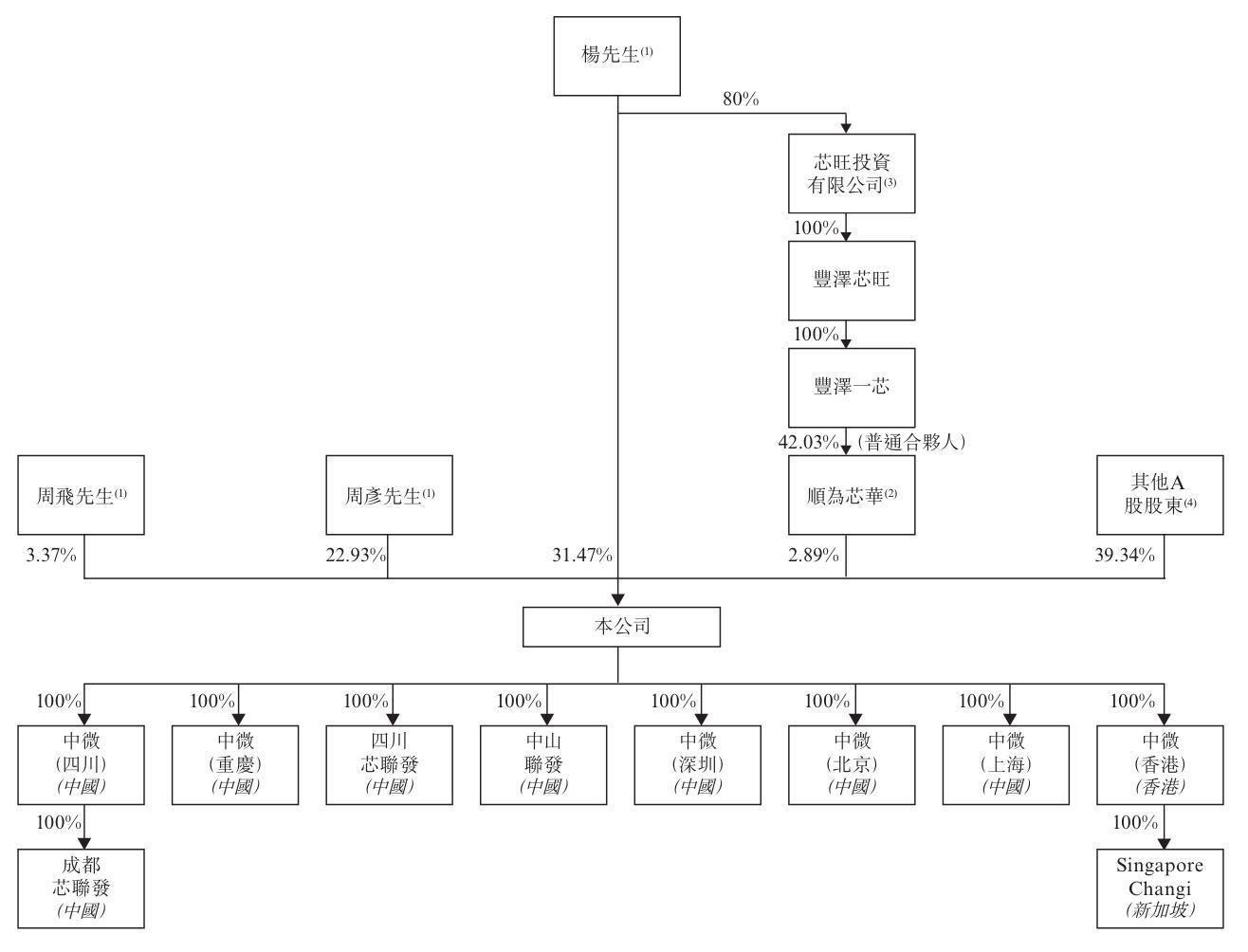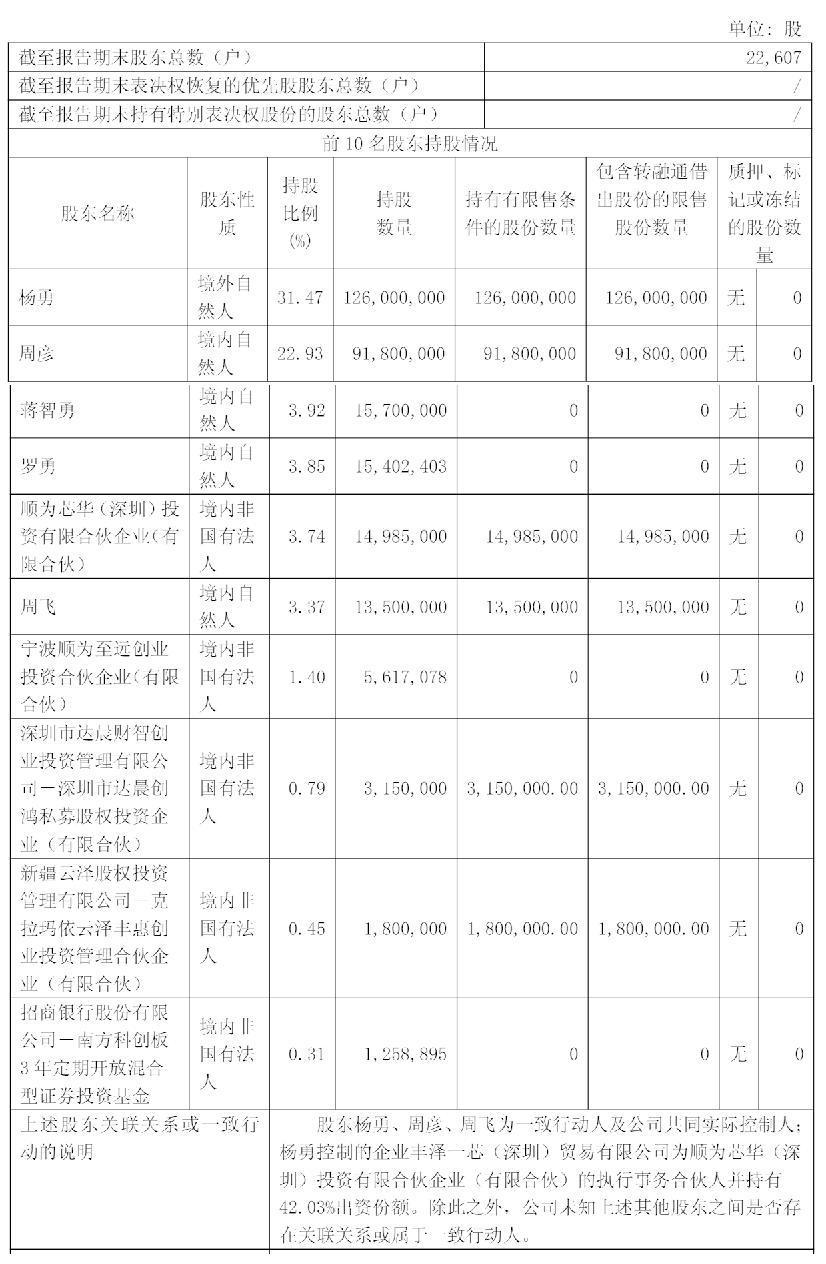 股东杨勇、周彦、周飞为一致行动人及公司共同实际控制人;杨勇控制的企业丰泽一芯(深圳)贸易有限公司为顺为芯华(深圳)投资有限合伙企业(有限合伙)的执行事务合伙人并持有42.03%出资份额。